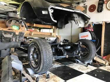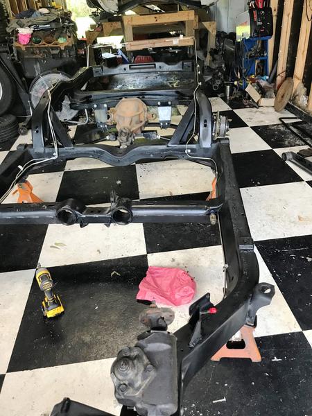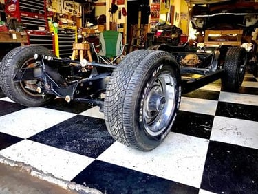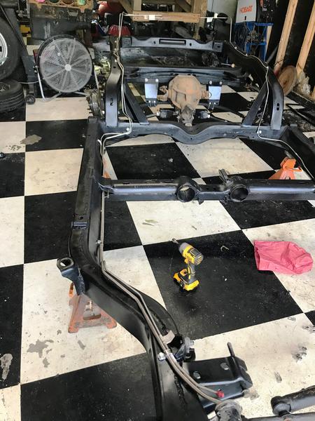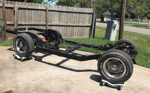 I coated the frame in the Summer of 2017. We were affected by the Hurricane Harvey Flood in August 2017. We got 36 inches of water in the house and 41 inches of water in the garage. We had a 30 MPH water current, which is what did the most damage. I found suspension parts in the ditch. I was able to find all of the main components, but lost most of the mounting hardware. I cleaned up the frame and installed the suspension as best I could with the mounting hardware I could find. I installed the fuel lines and brake lines.