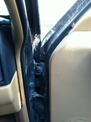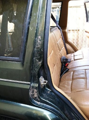 We cleaned out the interior this afternoon and let it air out some. When Allison went through the ditch in the wreck, thankfully the ditch was full of water which help slow her down a lot before impact. She went from 65 MPH to 0 MPH in less than 50 feet. I had washed the mud off the outside, but noticed this afternoon some of the mud which got between the doors and door frames.