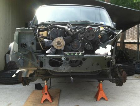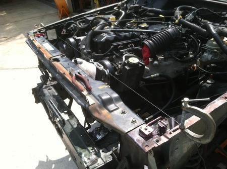 Then I used the support brackets to bolt it into place as well as the upper radiator support. I mocked up the front header panel/grill to see if it was level and square.