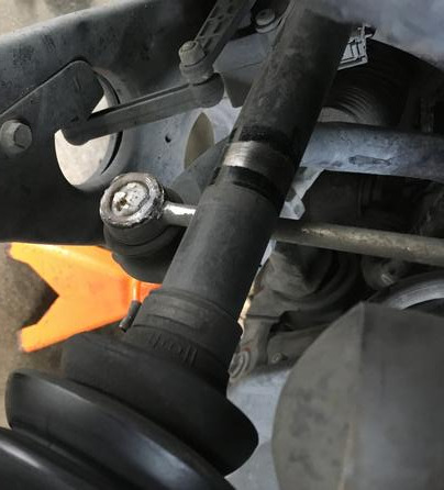 Driving home one day Will accidentally hit a curb with the driver's side wheel. After he got home, I took the Mini for a drive, and immediately turned around while hoping I will make it back home. I could tell there was some serious suspension/steering damage beyond the visible wheel damage. I was able to back the car into a space on the side of my garage where I knew it would stay for quite a while waiting to be repaired. I pulled the front wheels off and inspected the steering and suspension. At first I could not find any obvious damage but soon saw where the drive shaft on the driver's side had been rubbing against the sway bar linkage. Where the linkage bolted to the sway bar, the bolt head was broken off.