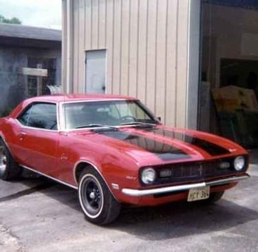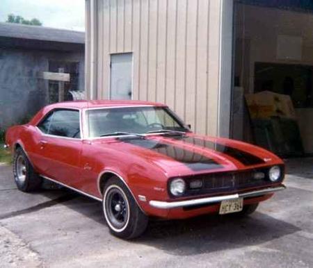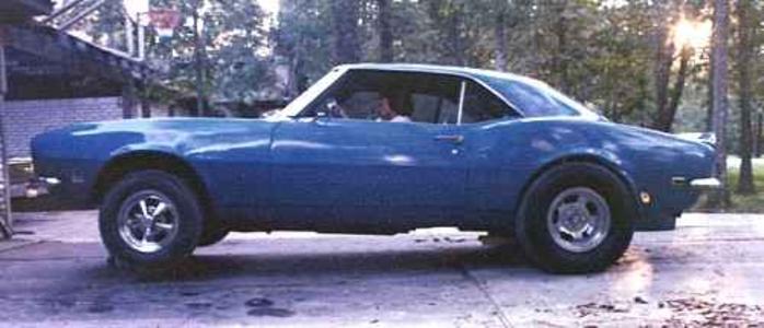 Here is my '68 Camaro. I had several different paint schemes along with several different engine/trans combos. I had as small as a 327 small block to a 396 big block. I had a 3 speed manual trans and ended up with a M-22 four speed. Notice the old style traction bars underneath. In this pic, I had just put the slicks on to take it out to the drag strip. Jack-stands are under the front to get this pic of the Camaro pulling a "wheelie" No photo shop here, just jack-stands.