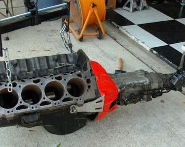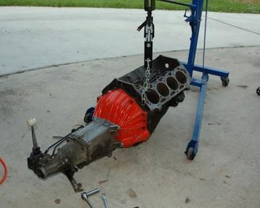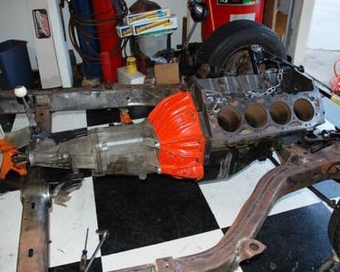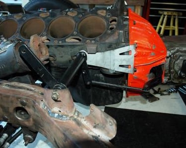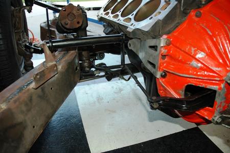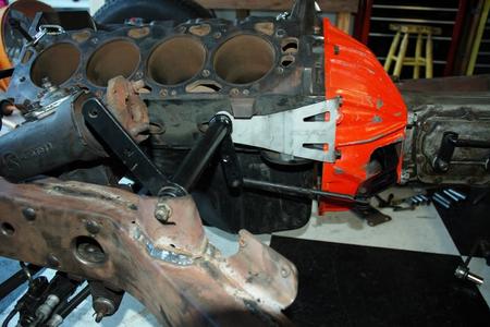 I dropped the 454 block w/ 4 speed on the frame. I needed to do this to confirm that the clutch pivot bracket was in the exact correct spot. Notice that I have to use the bolt on pivot ball bracket from Scoggins-Dickey since the Gen V Big Blocks have no boss for the pivot ball. Everything lines up perfectly!