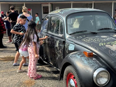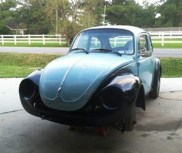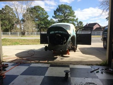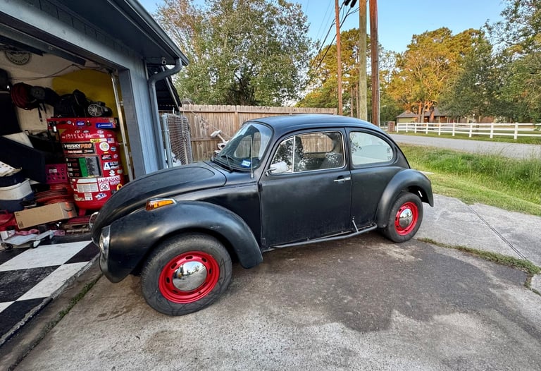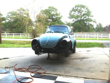 When I got to this point in the Bug project, we were hit hard by the Hurricane Harvey Flood. The Bug was parked behind the gate under the carport. We got about 4 feet of water in the garage. The Bug floated for about an hour before going underwater. About a year later, after the house was rebuilt, I was finally able to work on the Bug again. I built a fresh 1776 for it and finished painting the Bug Semi-Gloss Black. I discovered that this particular paint works well for drawing on with chalk. As my wife and I go to car shows, we notice that kids who are brought along look bored. I decided to bring the Bug so kids could draw all over it with chalk. Turns out kids of all ages loved drawing on the Bug. So the Bug is now known as the Chalk Bug. I am creating a website just for the Bug called chalkbug.net. It will soon be live. Check out the latest with Chalk Bug there.