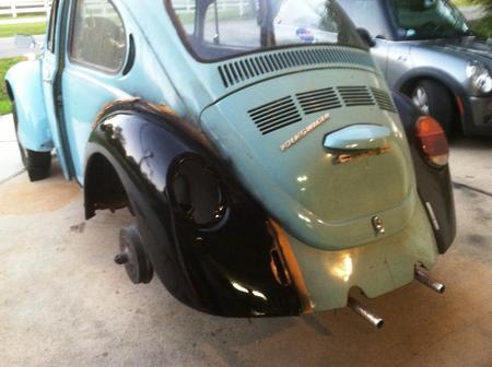 I replaced the passenger-side rear fender and primed it black, then top coated it semi-gloss black.