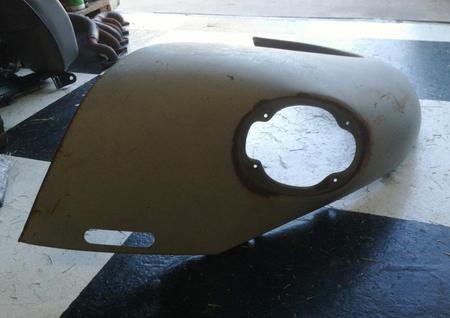 I replaced the old fender with one in better shape. I got a late start so I was not able to complete the job. On this fender I used 80 grit sanding discs so I could use my pneumatic sander. That made the prep part a lot easier. I sprayed only one coat of black primer before I had to put everything up for the day.