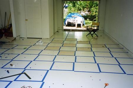 After painting the floor with White Epoxy, I started taping 2 X 2 foot squares for the Black paint.